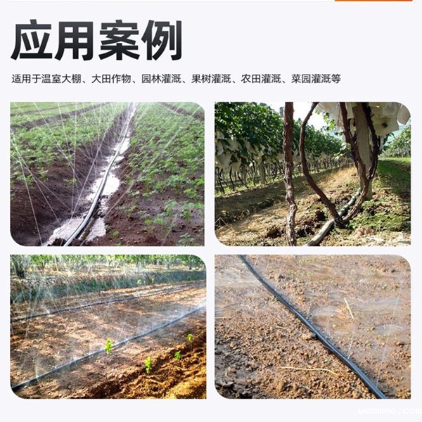 喷灌带安装主管不要直接连在高压、水泵上,中间用厚皮管过渡;换茬时,将微喷或主管带拆除后妥善保在阴凉处,可延长寿命;喷水带平铺在地面,出水口朝上,平地铺长度N45型60米,N35型40米。